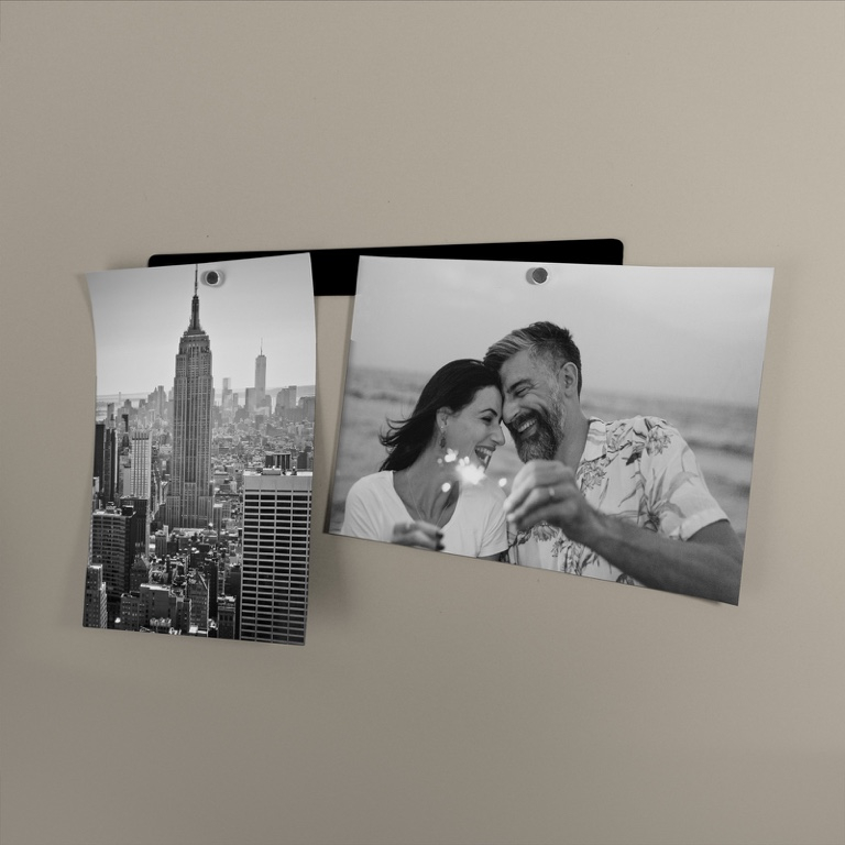 Bandes autocollantes noires. Leur surface adhésive peut être fixée où vous le souhaitez. Créez un tableau magnétique minimaliste pour accrocher vos photos ou notes importantes avec les aimants Trendform ! Aimants non inclus.
