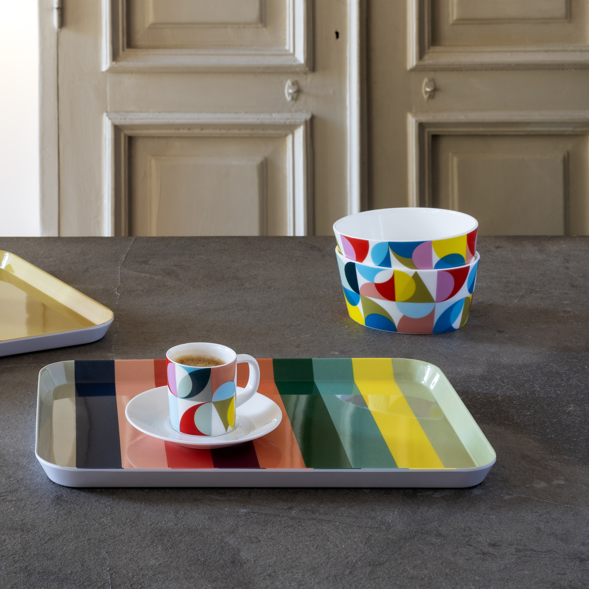 L’accroche-regard dans la cuisine : un plateau coloré avec un revêtement brillant imprimé.