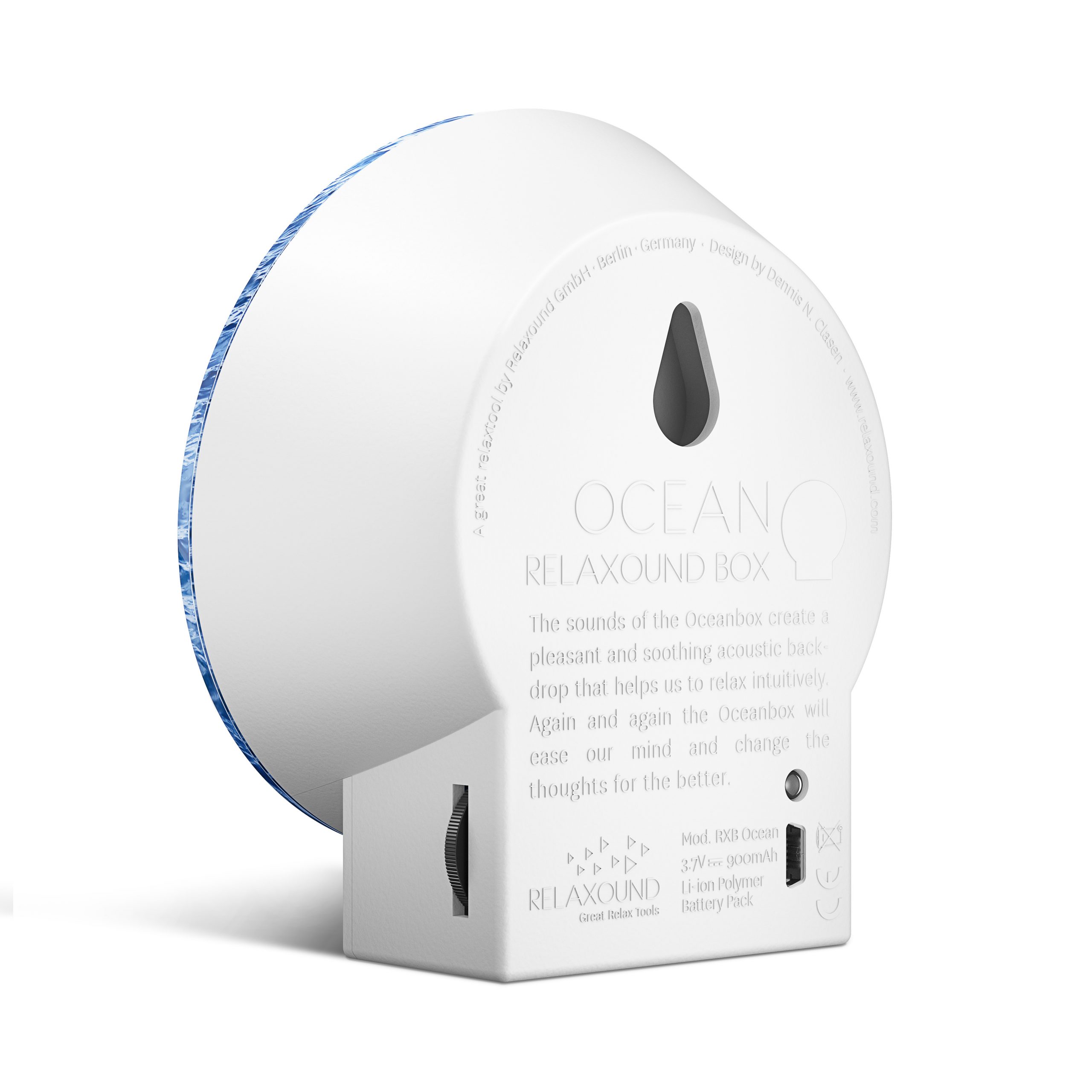 Tout comme la mer et son paysage sonore, le design de l’Oceanbox est également fascinant. Sa forme épurée lui donne un accent maritime. Le bleu vif et le blanc sont les couleurs typiques de l’océan. La forme fait penser à des coquillages ou des structures de bateaux. Notre motif exclusif de vagues donne encore plus envie d’être au bord de la mer.
